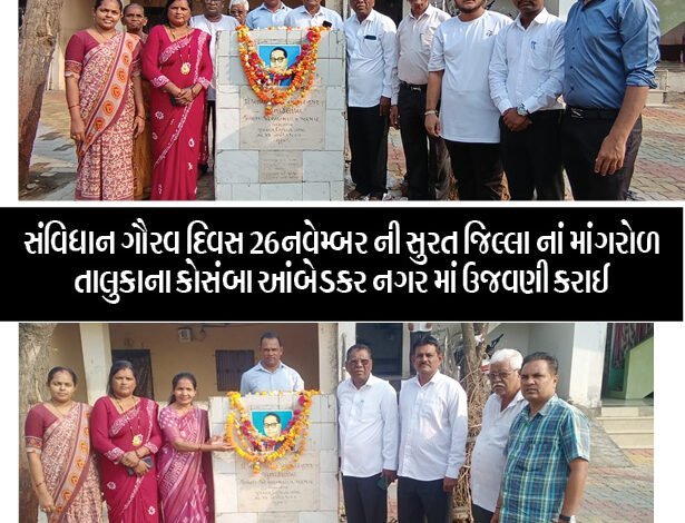 સુરત જિલ્લાના માંગરોળ તાલુકાના કોસંબા ગામે સ્થિત ડૉ. બાબા સાહેબ આંબેડકર નગર ખાતે આજે, 26 નવેમ્બર રોજ સંવિધાન ગૌરવ દિવસ નિમિત્તે વિશેષ કાર્યક્રમનું આયોજન કરવામાં આવ્યું. સંવિધાન દિવસ, જેને રાષ્ટ્રીય કાયદા દિવસ તરીકે પણ ઓળખવામાં આવે છે, ભારતની બંધારણ સભાએ 26 નવેમ્બર 1949ના રોજ બંધારણ સ્વીકાર્યું હતું અને જેનો અમલ 26 જાન્યુઆરી 1950થી થયો હતો, તેની સ્મૃતિમાં ઉજવવામાં આવે છે.